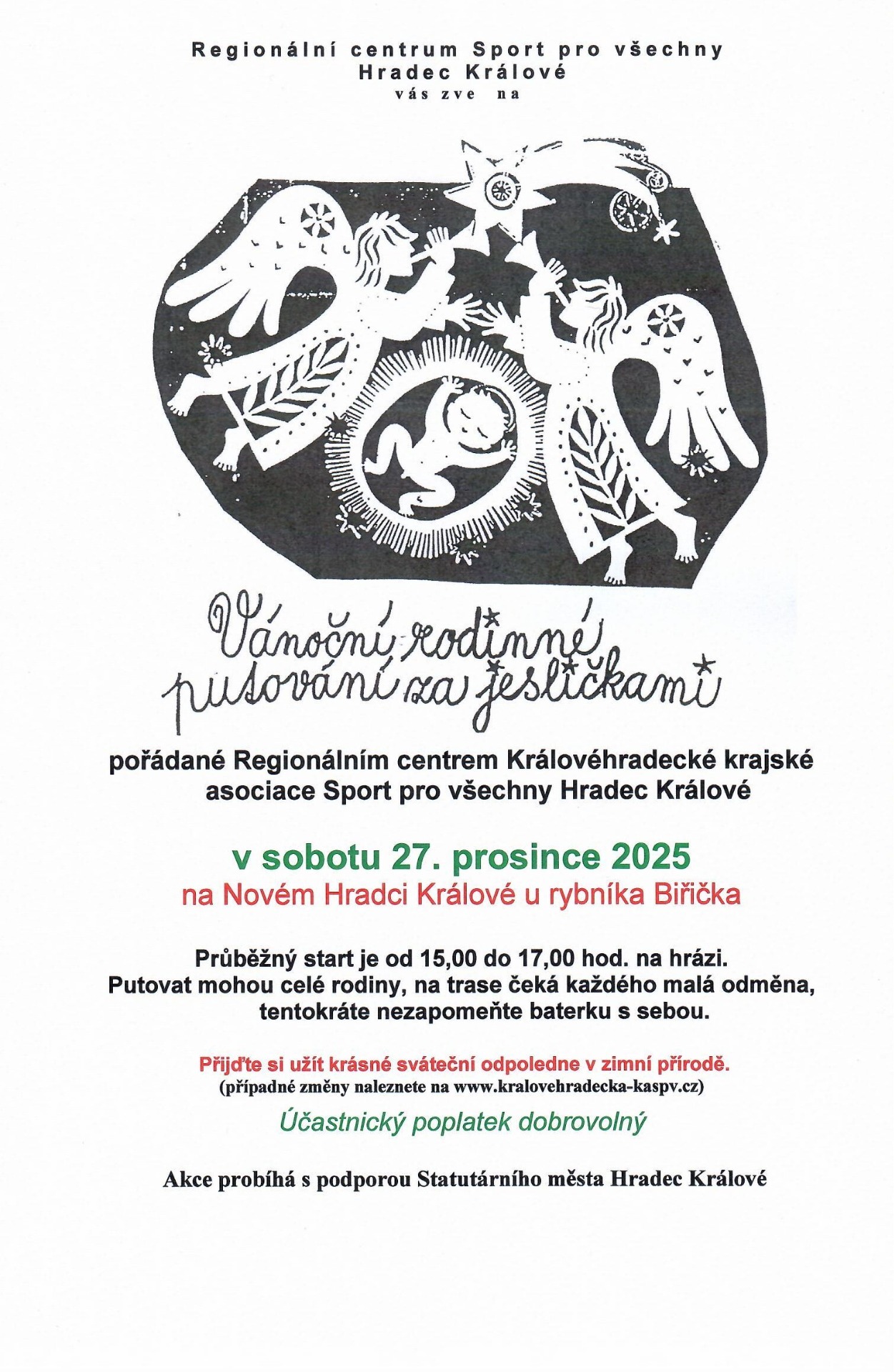 Zveme Vás na tradiční vánoční akci - Vánoční rodinné putování za jesličkami, které se uskuteční v soboru 27.12.2025 mezi 15 a 17hod.Začátek putování na hrázi rybníku Biřička na Novém Hradci Králové. Tras je cca v délce 3 km, vhodná i pro kočárky. Cesta je vyznačena světýlky, část reflexními pásky (zde je nutná baterka a příchod již se stměním). Děti najdou na trase malou odměnu. Cíl je u "Ježíška", kde se zpívají koledy, vyprávějí říkanky.